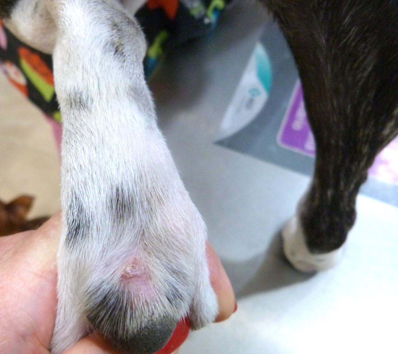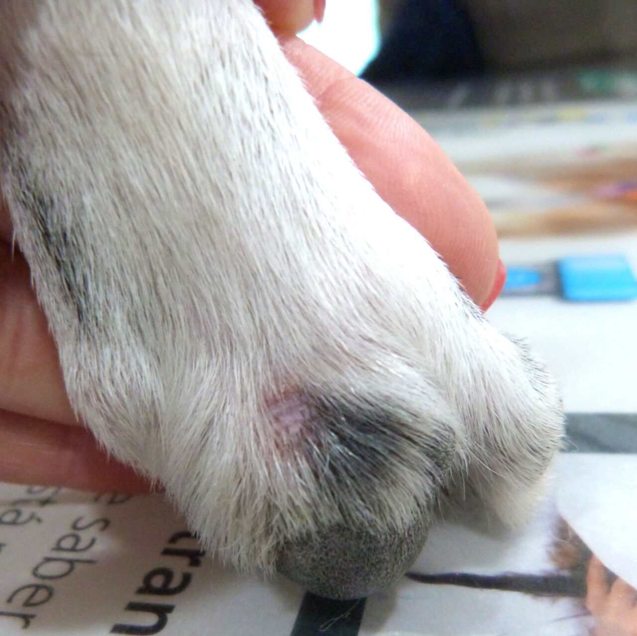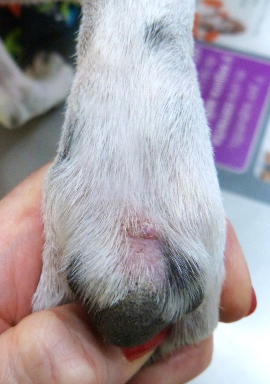En todos los casos las lesiones parecían indoloras. No se observaban signos de lamido como pelo teñido, aunque es cierto que la cara posterior del metatarso es una zona de difícil acceso, y más para un bulldog francés.