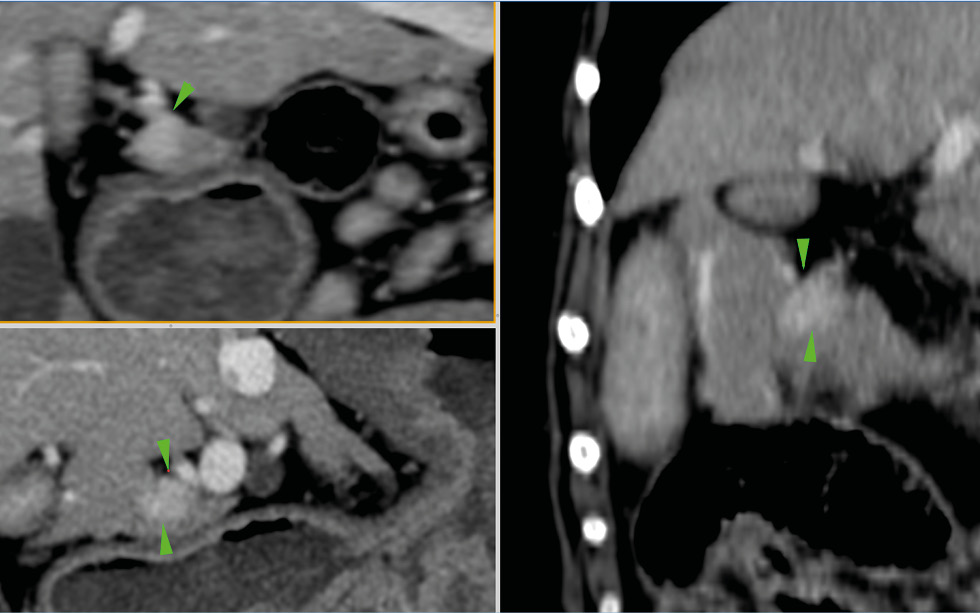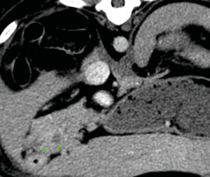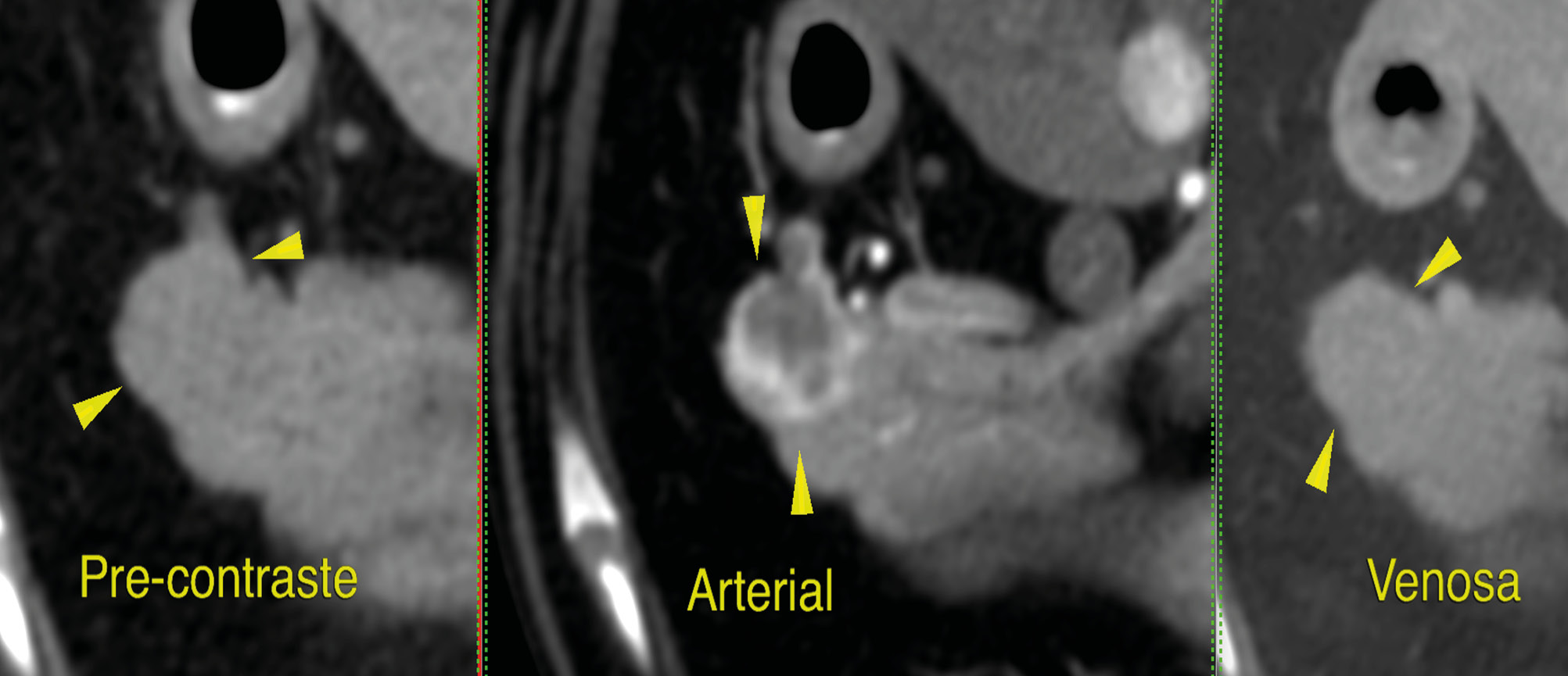 La tomografía computarizada (TC) puede ser particularmente útil en la investigación de insulinomas, puesto que el gas en el tracto gastrointestinal no supone una limitación y es una prueba más sensible en la identificación de pequeñas lesiones, aunque para ello se suele necesitar la TC de fase dual. El insulinoma se caracteriza por presentar una imagen de nódulo hipoatenuante con un gran refuerzo, únicamente en la fase arterial del estudio (halo de contraste alrededor del nódulo) y no en otras fases (imagen 1).