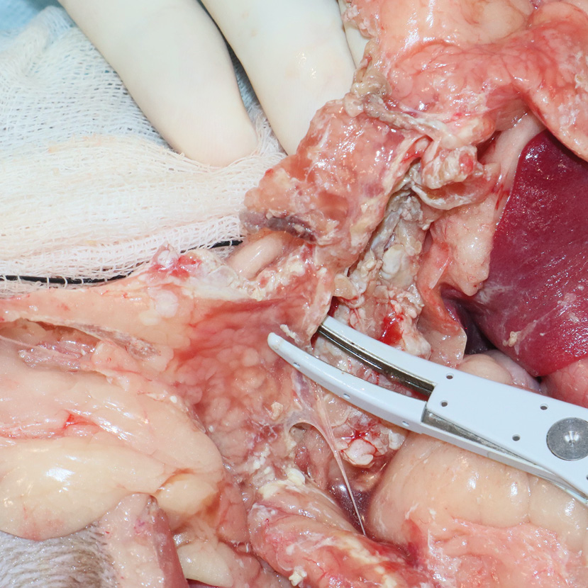 La técnica de disección roma permite extirpar tejido pancreático de cualquier región.1,6 La biopsia laparoscópica mediante el uso de pinzas, fórceps (imagen 8), punch o ligaduras intracorpóreas laparoscópicas, así como los selladores vasculares, ofrece una sensibilidad diagnóstica similar con menor tasa de complicaciones y rápida recuperación del paciente, por lo que es la ideal en perros.7 La porción distal del lóbulo izquierdo puede biopsiarse con el paciente en decúbito lateral derecho mediante retracción medial de la región gastroesplénica.8