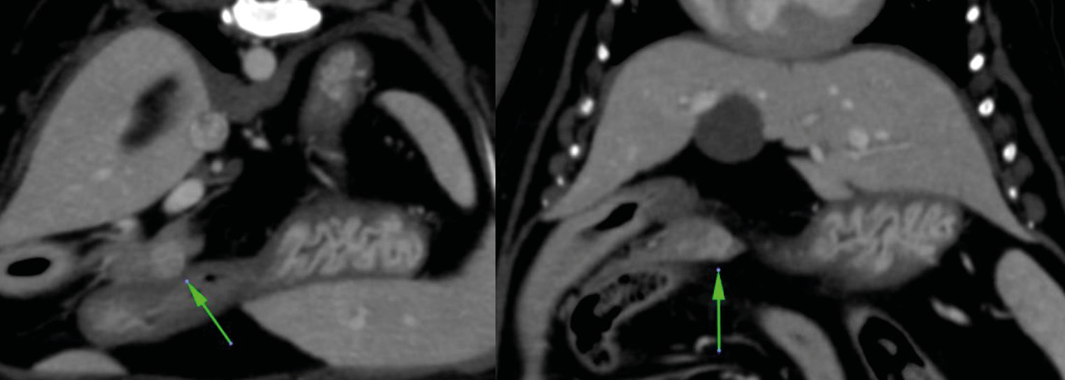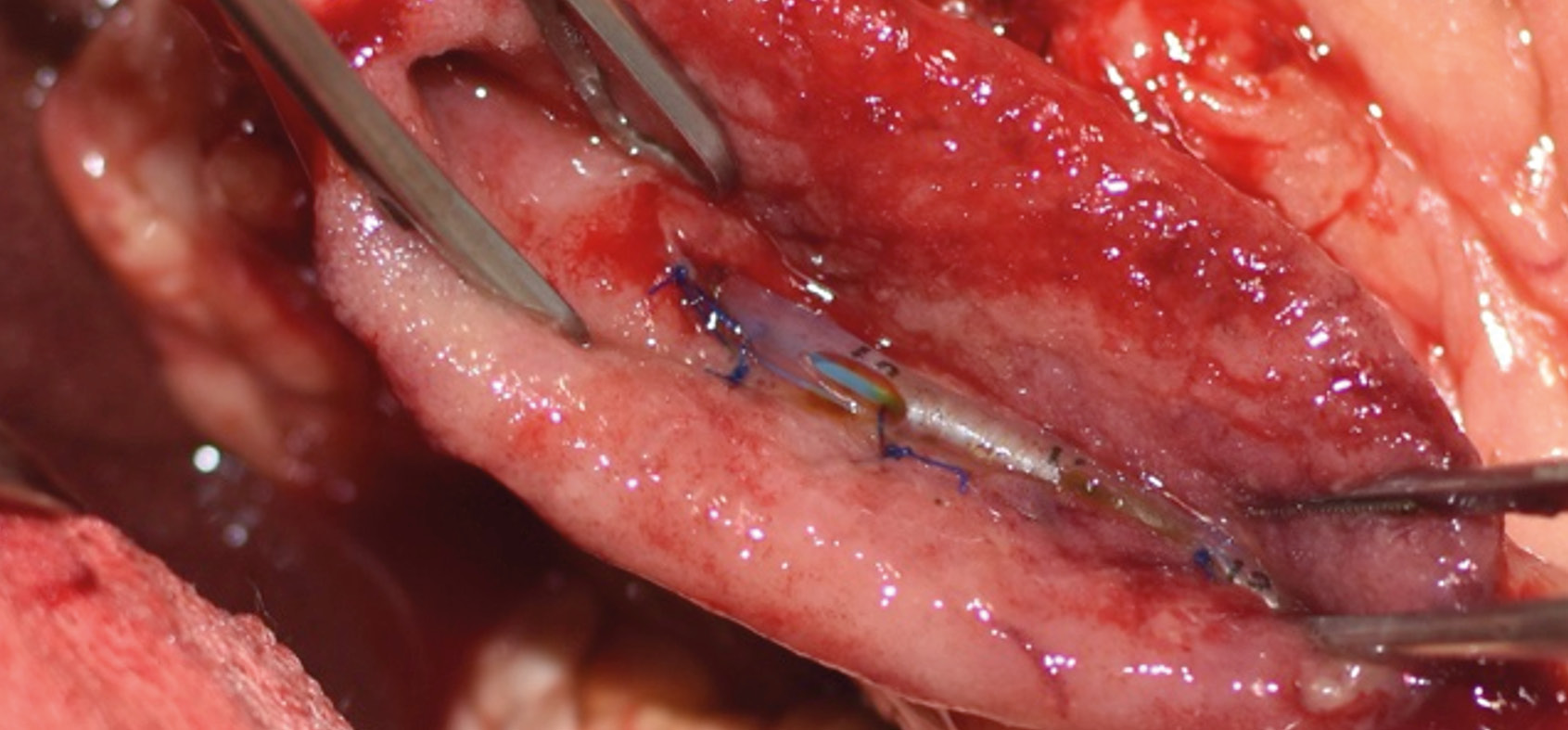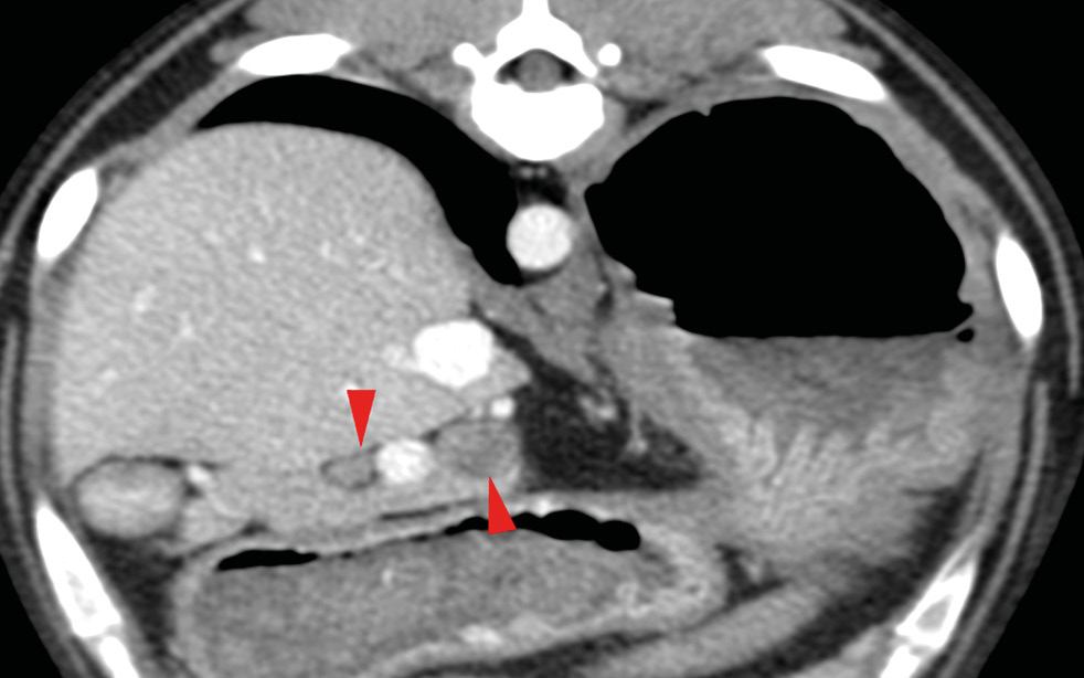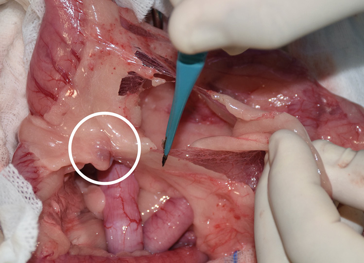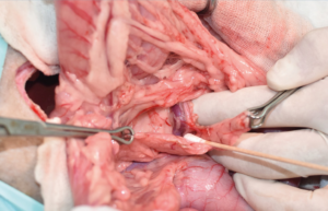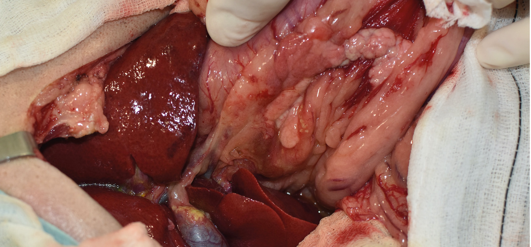 En casos de obstrucción biliar se debe considerar la duodenotomía y la colocación de un stent temporal en el colédoco, que sale al duodeno a través de la papila duonedal mayor, mientras se resuelve la compresión temporal por el absceso/inflamación (imágenes 2A y 2B). La colocación de stents de colédoco también se ha descrito en gatos.25-27 En esta especie, durante este procedimiento se debe tener cuidado de no cateterizar el conducto pancreático debido a la conexión anatómica entre el conducto pancreático y el conducto biliar común.28