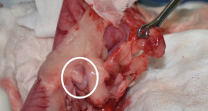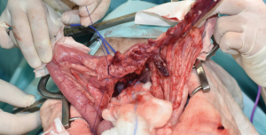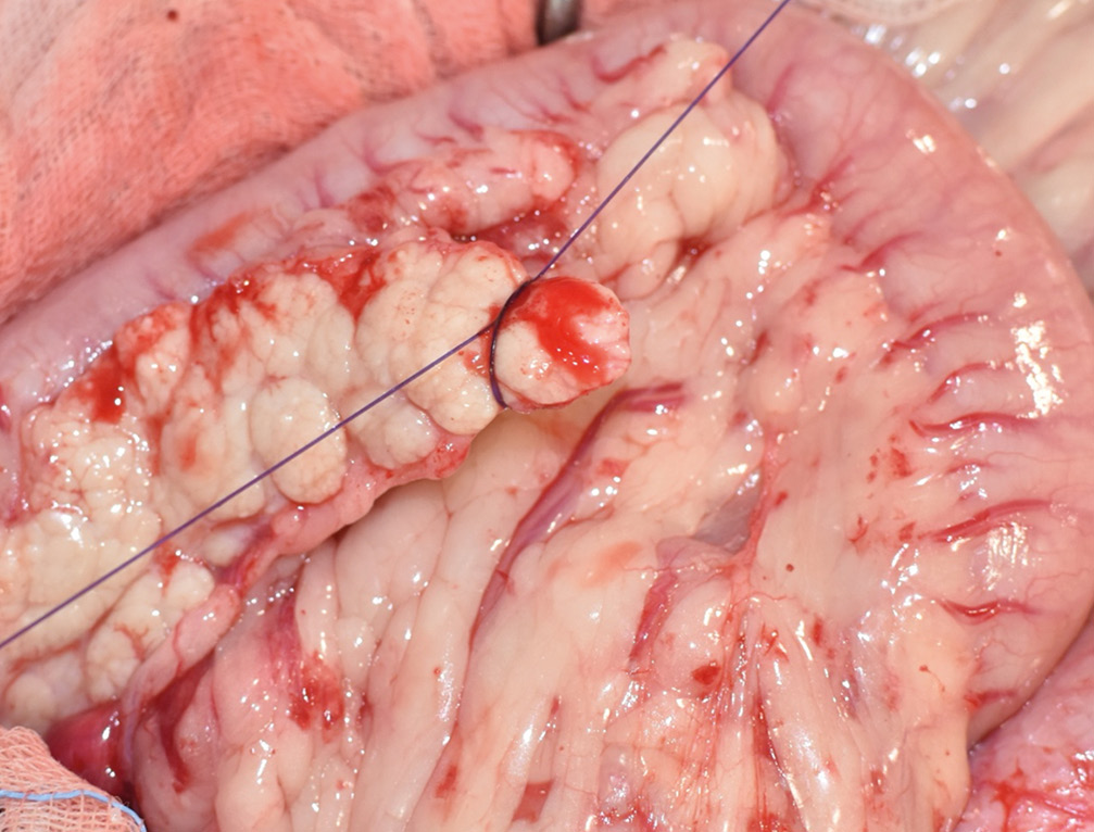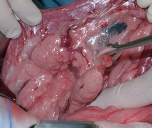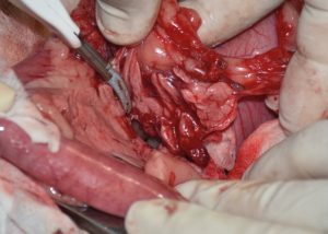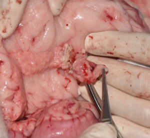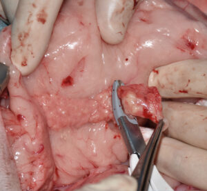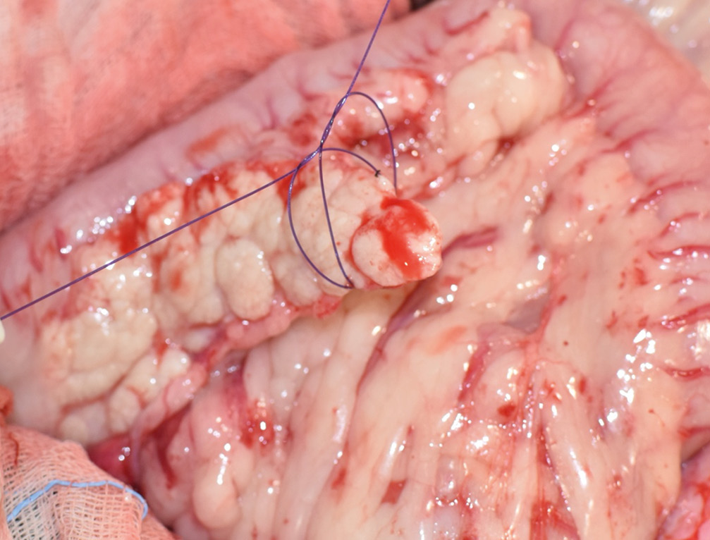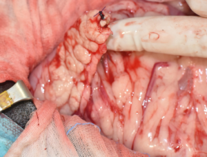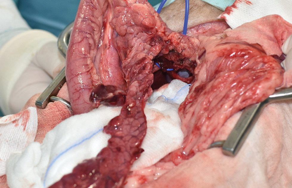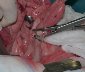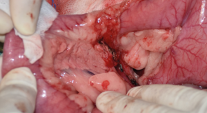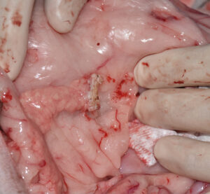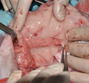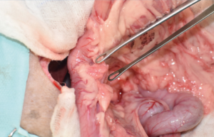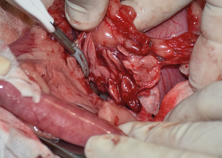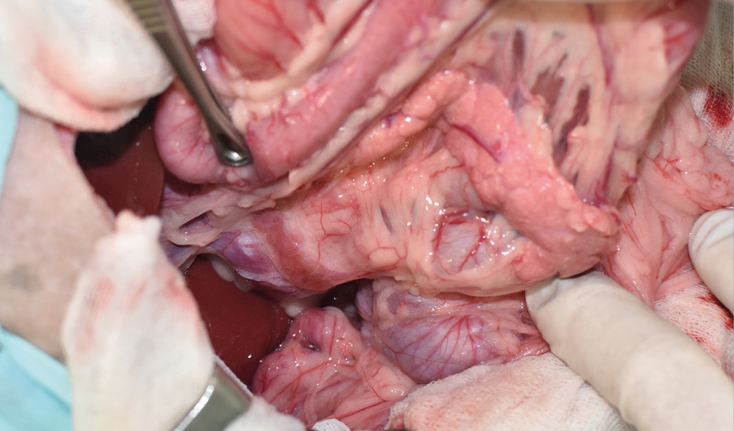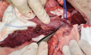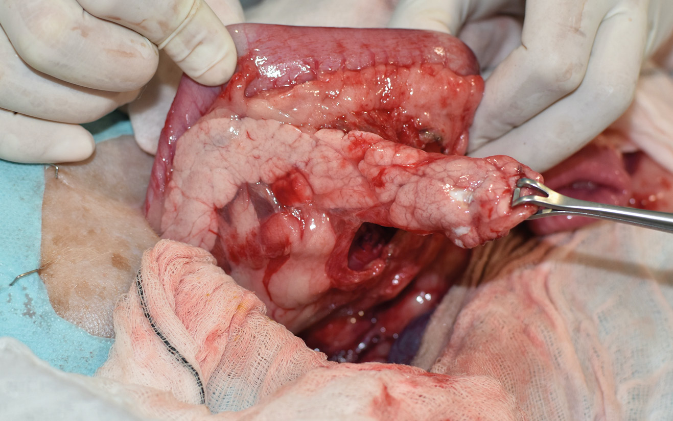 Imágenes 9A y 9B. Imágenes quirúrgicas de una pancreatectomía parcial del lóbulo izquierdo en un perro, por una lesión provocada por una mordedura, usando la técnica de “guillotina” (sutura/fractura) con el nudo de Miller modificado.