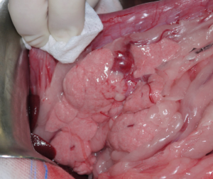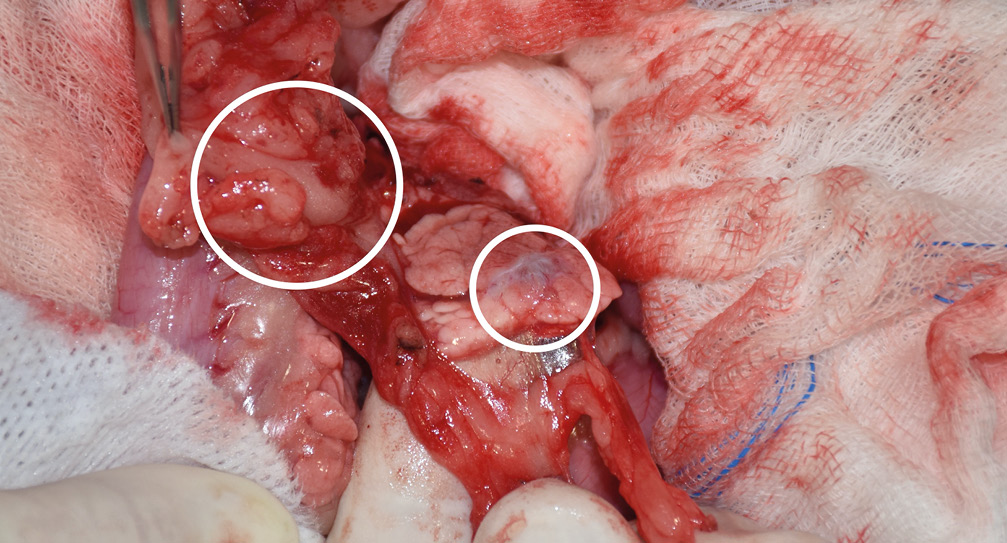 El tratamiento quirúrgico es el de elección para perros con enfermedad en estadio I (enfermedad localizada) o II (presencia de metástasis locorregional) e implica una pancreatectomía parcial para extirpar el tumor primario y cualquier metástasis visible (imágenes 4A-4K y 5A-5H). La mediana de supervivencia es más larga en los perros tratados quirúrgicamente en comparación con los perros tratados médicamente, como se describe en dos estudios donde la mediana del tiempo de supervivencia de los perros sometidos a pancreatectomía parcial fue de 381 días y 785 días, respectivamente, en comparación con 74 días y 196 días, respectivamente, en aquellos tratados solo con tratamiento médico.30 En otro estudio reciente, el tiempo medio de supervivencia registrado para 49 perros con insulinoma fue de 561 días y de hasta 746 días para perros que tuvieron resolución de hipoglucemia, con un tiempo medio euglucémico global (tiempos desde la cirugía hasta la primera detección de hipoglucemia en cualquier momento después de la cirugía) de 424 días para todos los perros.39