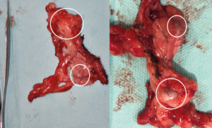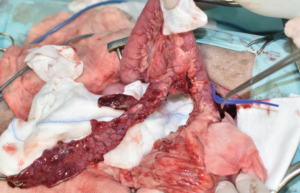 - Grapadora automática: en caso de resecciones amplias de la extremidad de un lóbulo se pueden usar grapadoras GIA, Endo GIA o TA, vasculares (grapas de 2,5 mm) o tisulares (3,5-3,6 mm).