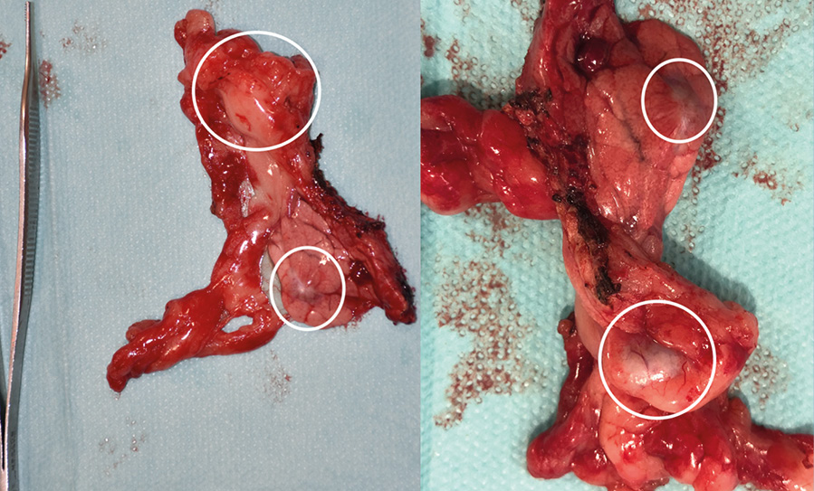 El hígado y los NNLL regionales deben ser inspeccionados, y cualquier posible metástasis retirada si es posible o biopsiada si no es retirable en su totalidad.20