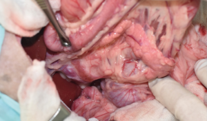 - Disección roma: indicada en nódulos delimitados de pequeño tamaño. Se realiza una cuidadosa disección de la porción que se va a biopsiar del resto del parénquima, vasos y todas las intersecciones afectadas mediante el uso de un mosquito hemostático o hisopos de algodón estériles. Los vasos sanguíneos se pueden cauterizar o ligar. Finalmente, se secciona el muñón liberado mediante cualquiera de las técnicas descritas en este apartado. Esta técnica parece ser menos traumática, ya que genera menos inflamación y adherencias, aunque aumenta el tiempo quirúrgico.1 En las pancreatectomías del lóbulo izquierdo, se deben evitar daños en los vasos esplénicos para preservar el bazo, que ayudará a prevenir infecciones posoperatorias. Si se producen daños en estos vasos, el bazo podrá preservarse si los vasos gástricos cortos y gastroepiploica izquierda (según técnica Warshaw) se mantienen intactos.