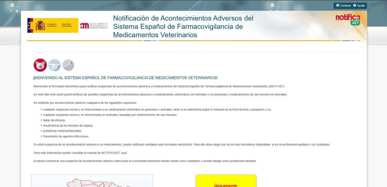 Página de bienvenida del sistema de farmacovigilancia veterinaria en España