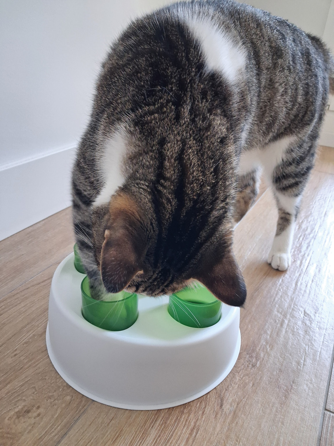 Comedero comercial antivoracidad diseñado para la especie felina.