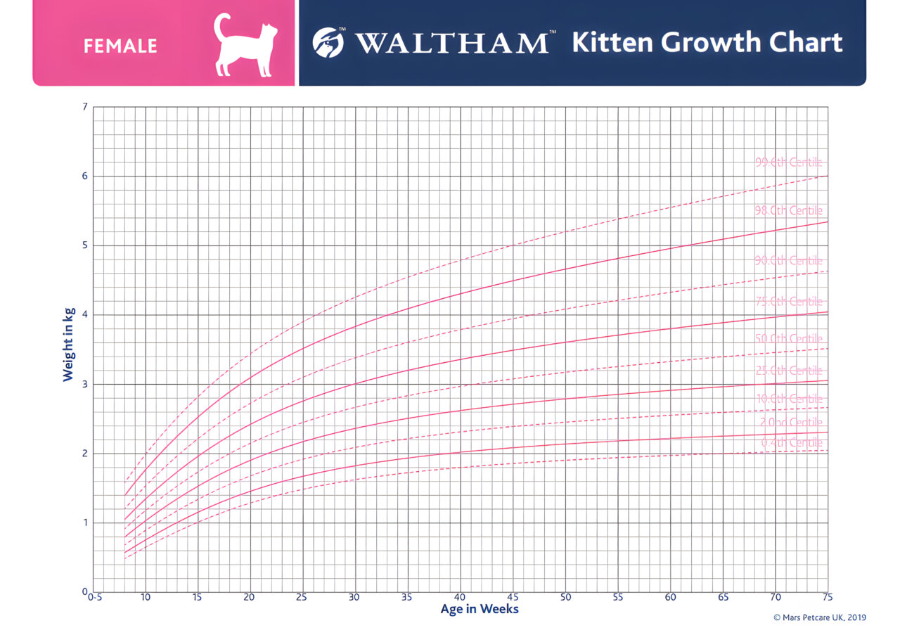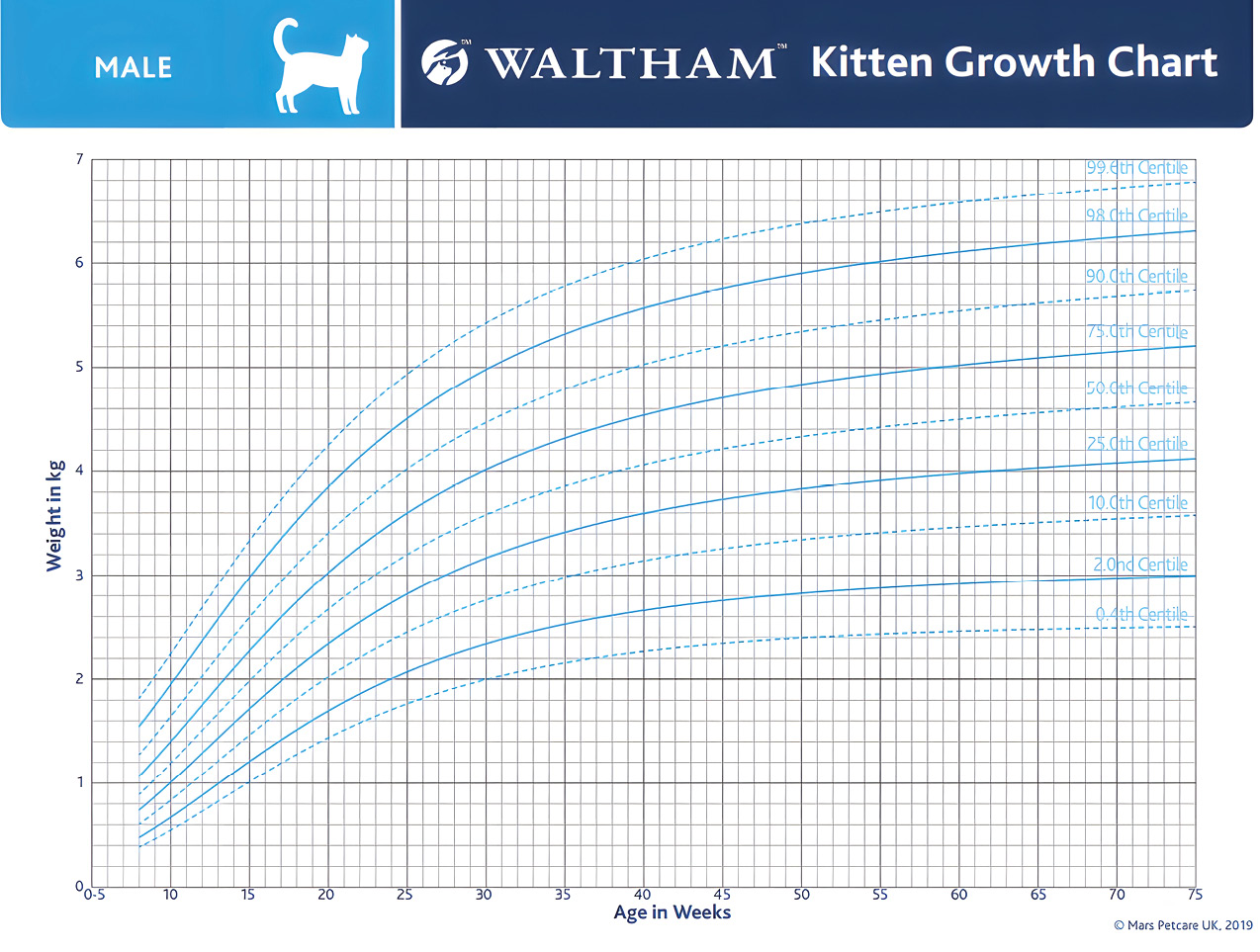 El mantenimiento de un peso corporal sano tiene que empezar desde edades tempranas12. Se debería monitorizar el peso y la condición corporal del gatito mensualmente hasta que llegue a su peso adulto, alrededor de los 12 meses de edad, mediante el uso de curvas de crecimiento que permiten valorar el desarrollo correcto del animal11 (imagen 3).