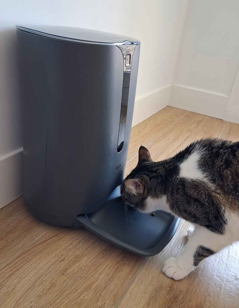 Los comederos automáticos (imagen 4) pueden facilitar la implantación de un plan de pérdida de peso, al repartir la ración diaria en varias porciones a distintos horarios del día, adaptándose al comportamiento alimentario del gato; además, disminuyen la asociación tutor-comida en el gato, reduciendo entonces el comportamiento de búsqueda continua de alimento20,28. Algunos de estos dispositivos incluso se activan con microchip; por lo tanto, podrían ser útiles en el caso de los hogares multigato20.