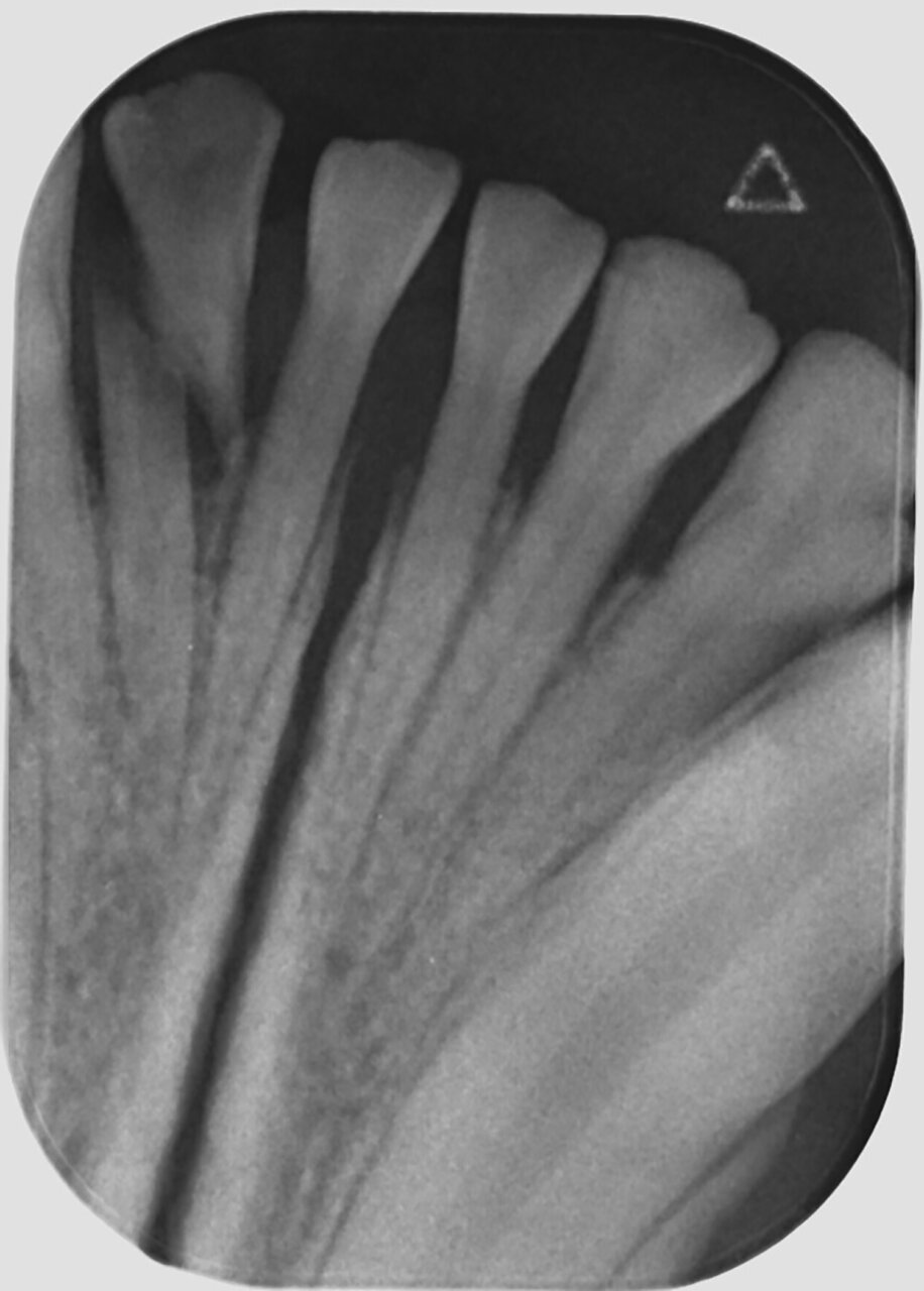 - Otra apariencia radiológica es el efecto chevron, que consiste en un área de radiolucidez, más frecuente en incisivos maxilares y dientes caninos en el perro, que radiológicamente se parece a lesiones de origen endodóntico. En este caso, la radiolucidez tiene una forma triangular y el espacio del ligamento periodontal no varía alrededor de la raíz (imagen 6).