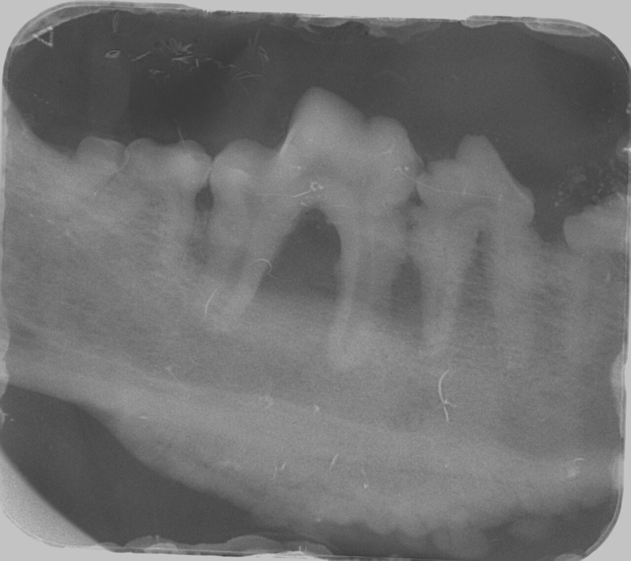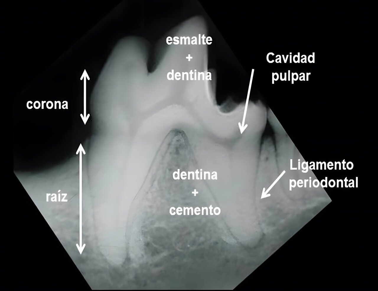 Uno de los aspectos importantes de la radiología es reconocer las estructuras del diente para detectar sus posibles alteraciones. En la imagen 1 se muestra una radiografía intraoral de un primer molar mandibular derecho (409) sano que nos permite ilustrar e identificar su aspecto radiológico. Así, el esmalte, la dentina y el hueso alveolar son radiopacas y la cámara y canal pulpar, así como el espacio del ligamento periodontal, son radiolúcidas.