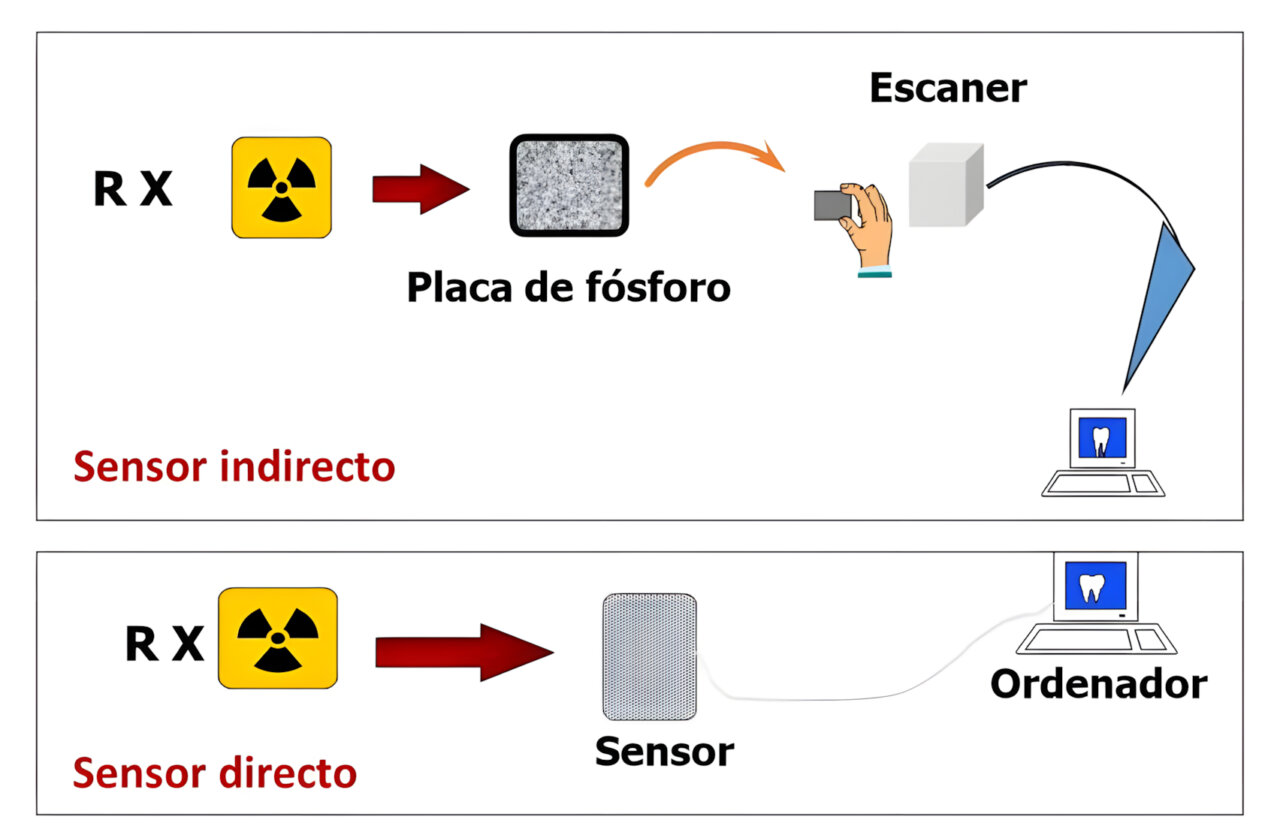 Los equipos específicos que necesitamos constan de un generador de RX periapical y un captador que puede ser un sensor digital directo, el cual proyecta la imagen directamente en un ordenador o un sistema digital indirecto mediante placas de fósforo que se procesan posteriormente en un escáner (CR) para su digitalización y visualización en el ordenador (imagen 2).