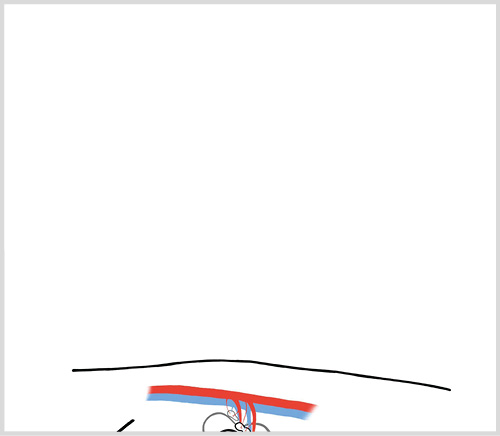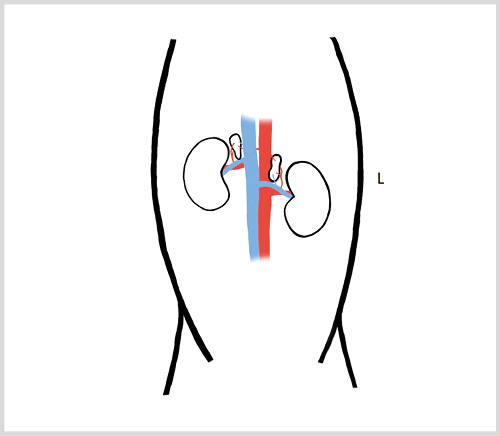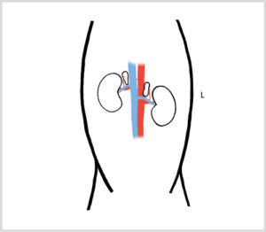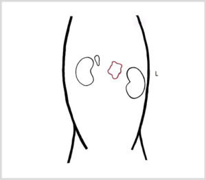 • Vista ventro-dorsal: desplazamiento caudo-lateral del polo craneal del riñón ipsilateral, lo que conlleva una rotación medial de su eje longitudinal.