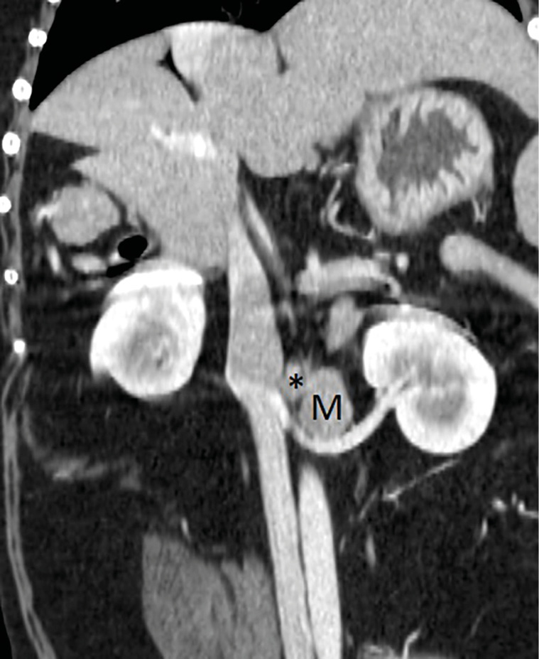 Imagen 5. Imágenes de TC en ventana de tejidos blandos en fase venosa tras la administración de contraste reconstruidas en planos sagital (A) y dorsal (B) donde se observa un defecto de llenado de la vena cava caudal (círculo negro) por la presencia de una masa hipoatenuante de 4 cm de longitud que se corresponde con un tromoboembolismo tumoral a través de la vena frénico abdominal (*) por un feocromocitoma en la glándula adrenal izquierda (M).