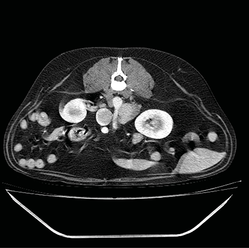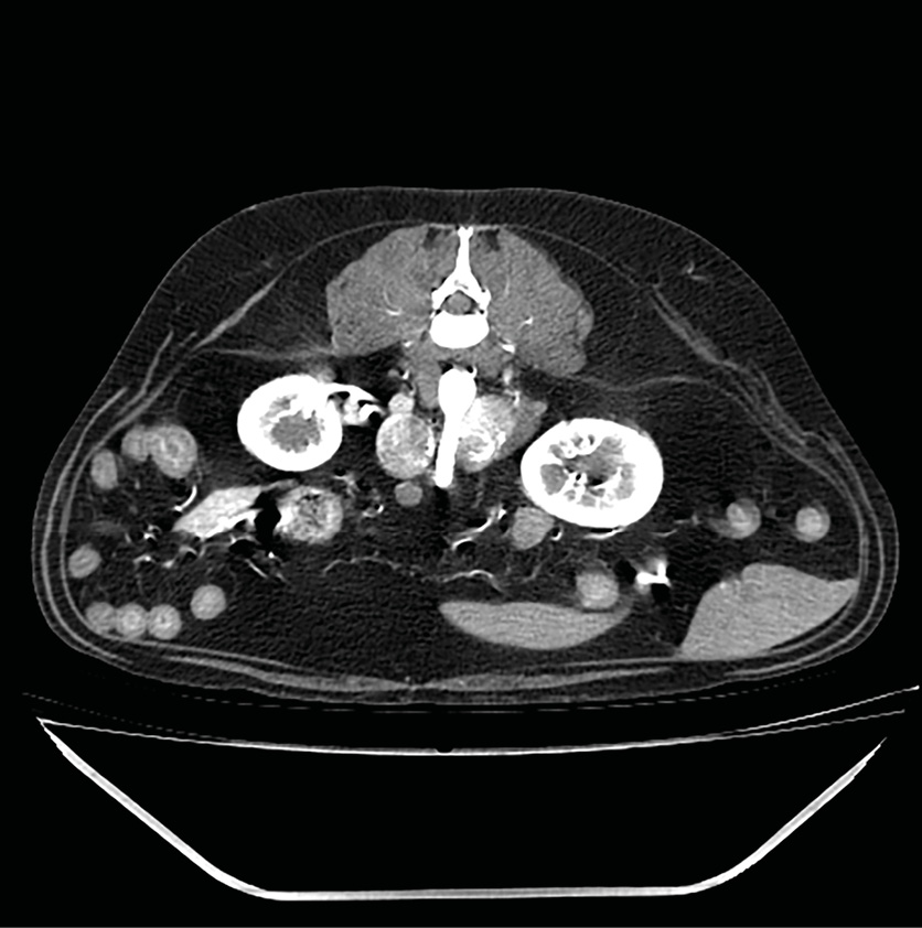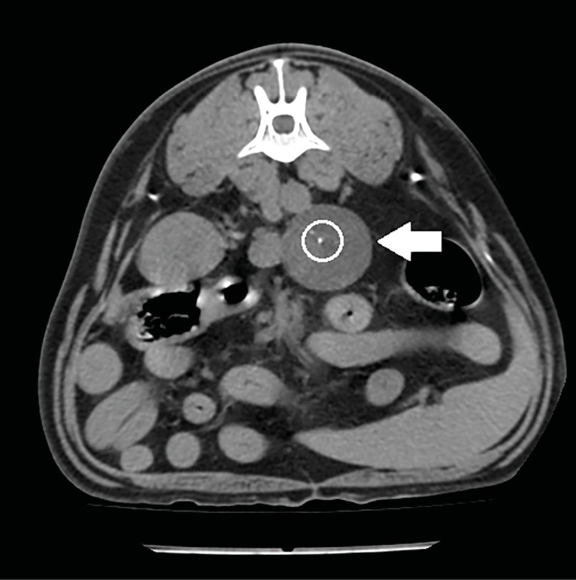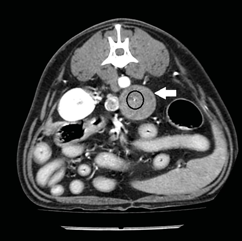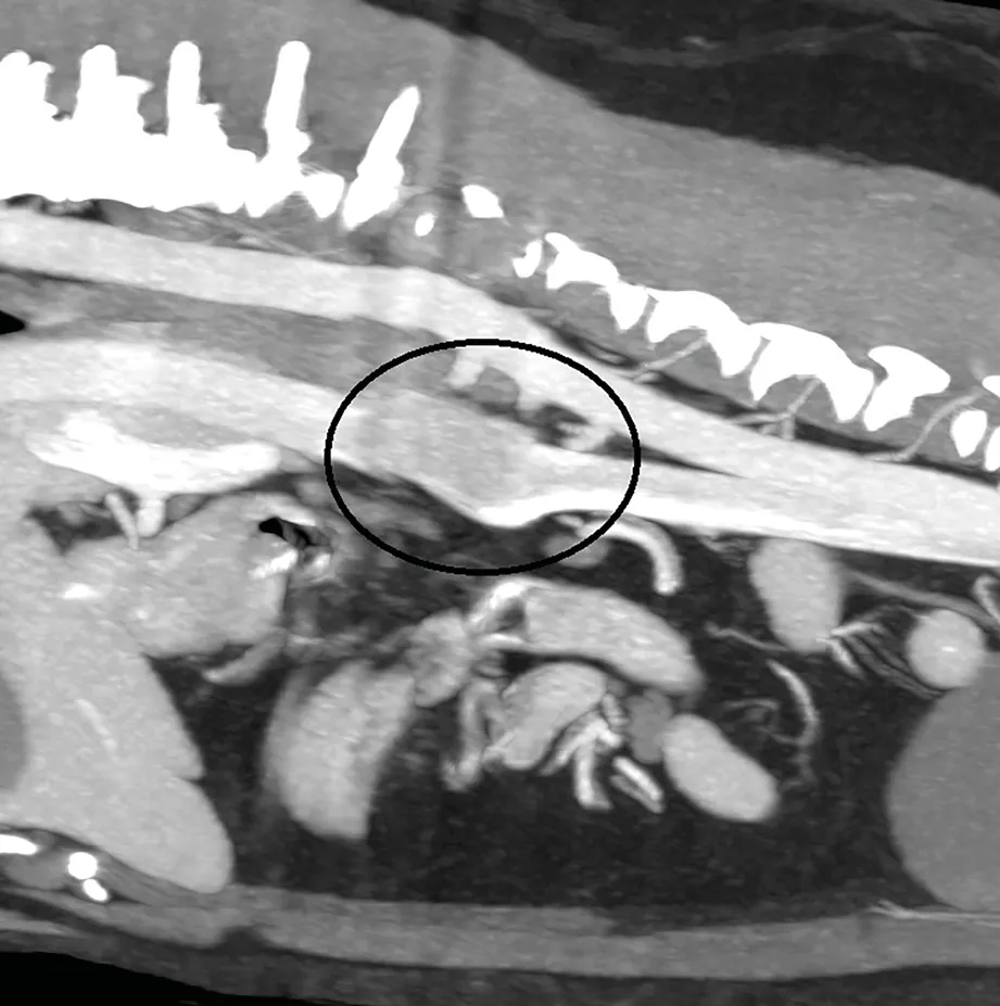 La tomografía computarizada (TC) es una técnica que va a emplearse habitualmente de forma previa a la cirugía en masas adrenales caninas, debido a que se considera más precisa que la ecografía para la detección de invasión vascular: tiene una sensibilidad y especificidad aproximada del 90 %28,29 (imagen 5) y esto es de gran importancia ya que, si existe invasión vascular, el abordaje quirúrgico será diferente.