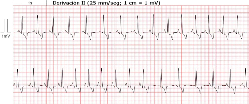 El ECG muestra una arritmia sinusal respiratoria (ASR) a 130 lpm. En un perro con sospecha de enfermedad cardiaca, la ASR es un indicio favorable, ya que sugiere una función hemodinámica compensada y descarta una activación simpática sostenida como mecanismo compensatorio.