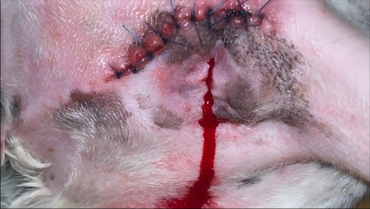 Pasadas 72 h tras la cirugía, el paciente tuvo que ser reintervenido quirúrgicamente por presentar una hemorragia activa de la arteria pudenda interna, que irrigaba el saco anal extirpado (imagen 3). Dicha complicación se solucionó con éxito.
