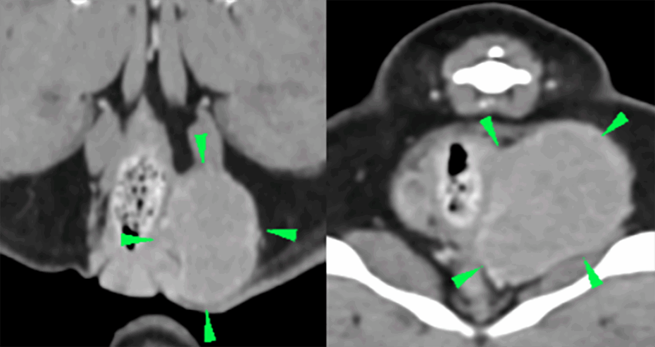 Tras el diagnóstico, y con el fin de completar el estadio clínico del paciente y trazar el plan terapéutico, se realizaron radiografías torácicas de tres posiciones (sin hallazgos fuera de la normalidad), ecografía abdominal (dentro de la normalidad) y estudio TC de tórax (sin hallazgos fuera de la normalidad) y abdomen, donde se evidenció una masa bien definida de 4,5×3,2×3,5 cm en el saco anal izquierdo, ovalada y de márgenes lisos, de atenuación tejido blando y realce homogéneo. La masa comprimía levemente el ano en su aspecto izquierdo (imagen 2). El saco anal derecho se presentaba sin alteraciones. Se observó un mínimo engrosamiento de los linfonodos glúteo y sciático izquierdos comparados con los derechos (con espesores de aproximadamente 3,5 mm). La forma y el tamaño de los linfonodos iliacos eran normales.