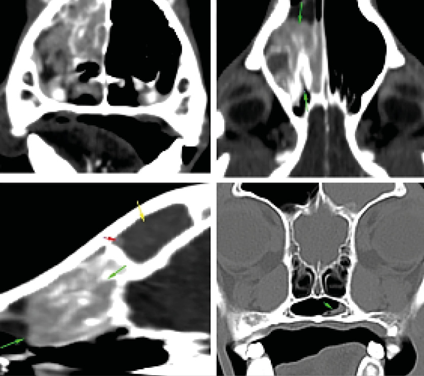 Los tumores nasales representan aproximadamente el 1 % del total de las neoplasias en la especie canina, y el adenocarcinoma es el tipo más prevalente en esta localización. La TC es una herramienta diagnóstica fundamental para la estadificación clínica y la planificación del tratamiento (imagen 23). En este contexto, la radioterapia de megavoltaje se considera la modalidad terapéutica de elección para el manejo de estos tumores.