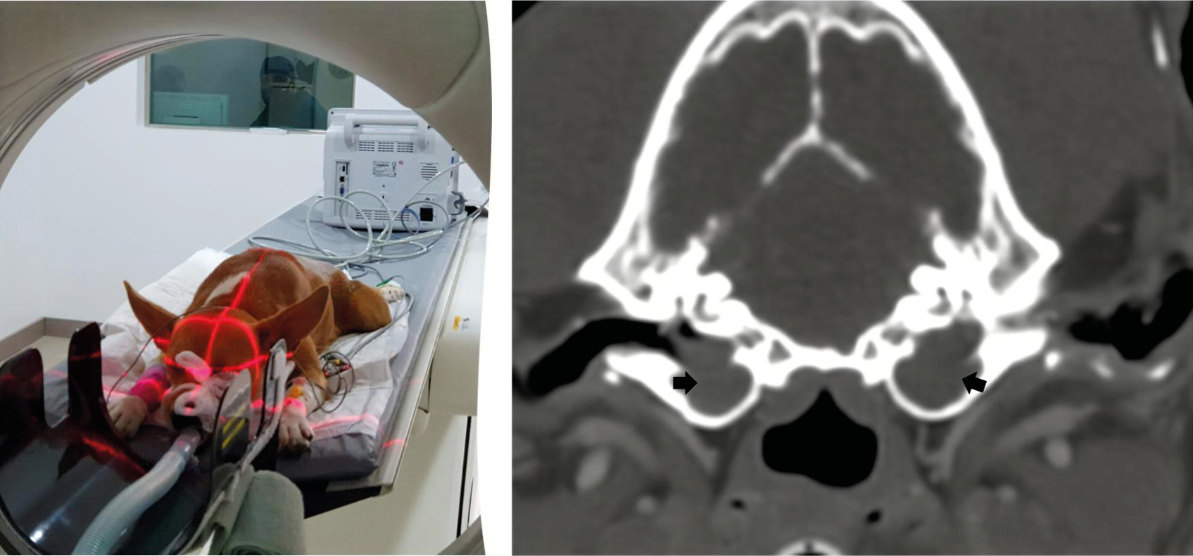 La tomografía computarizada (TC) se considera la técnica de referencia para el estudio de las estructuras del oído medio. Permite valorar la integridad y el grosor del tímpano, la presencia de contenido líquido en oído medio, masas y alteraciones en la estructura ósea de la bulla y huesos adyacentes mediante la visualización de las estructuras anatómicas en sección transversal, evitando la superposición de estructuras característica de las radiografías.