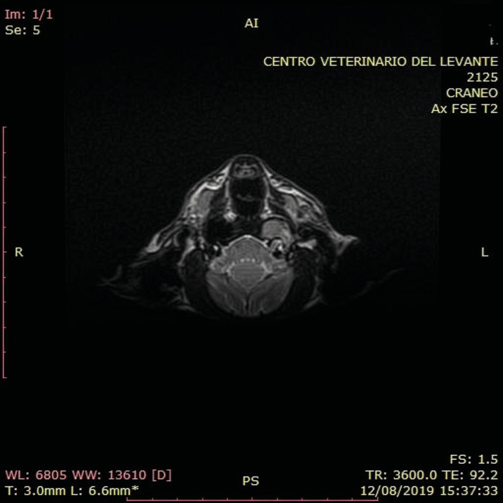 Al igual que en la TC, el paciente se coloca en decúbito esternal con la cabeza en la bobina de radiofrecuencia y las extremidades anteriores orientadas hacia caudal. Se pueden usar los mismos puntos de referencia que en la TC para facilitar el posicionamiento.