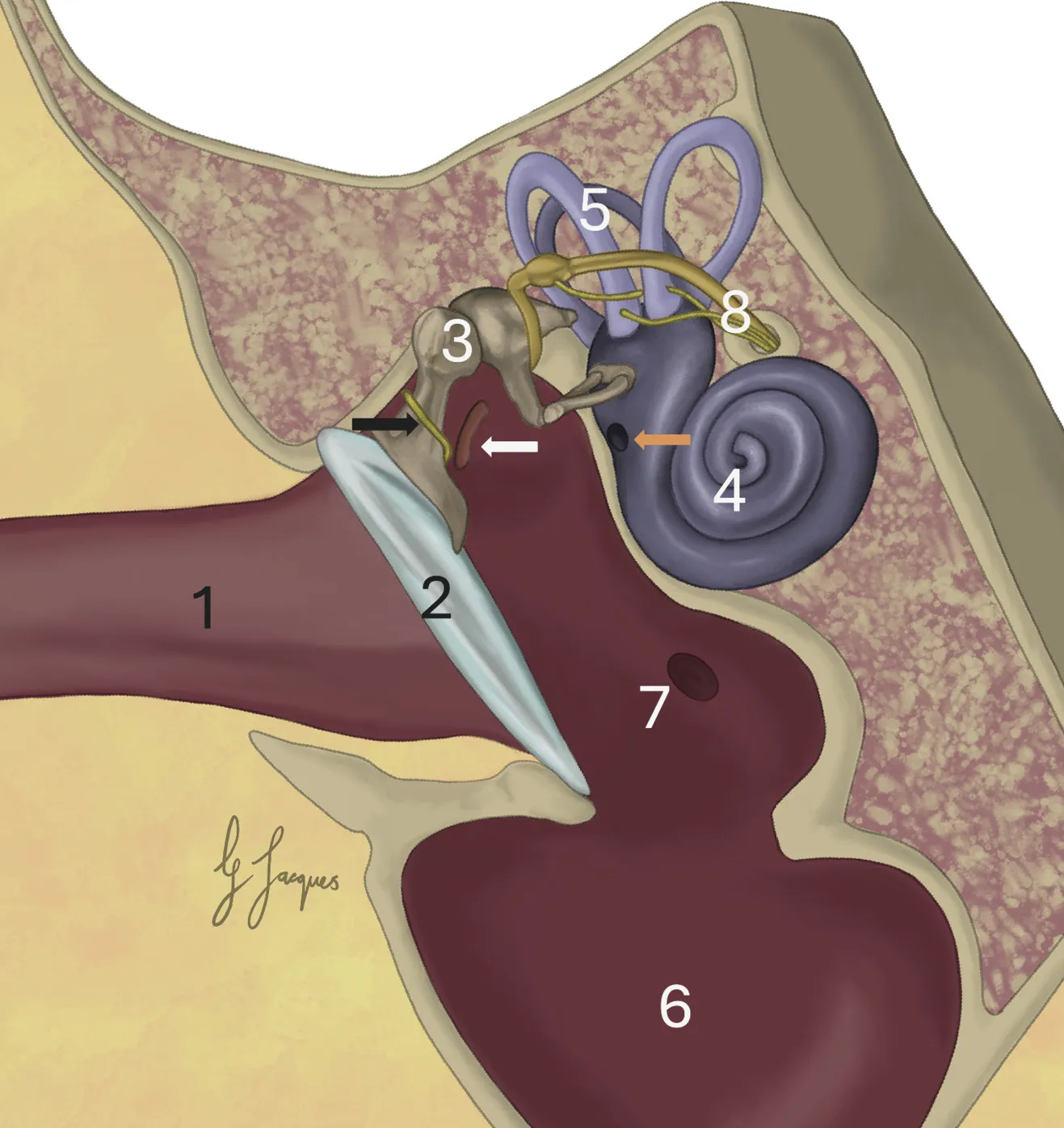 En el interior del oído medio se encuentran los tres huesecillos auditivos: martillo, yunque y estribo, que forman una cadena articular que transmite las vibraciones de la membrana timpánica hasta la ventana vestibular. Sus movimientos están regulados por dos músculos diminutos, el tensor del tímpano y el estapedio, cuya contracción protege al oído interno frente a estímulos sonoros intensos o repetitivos.