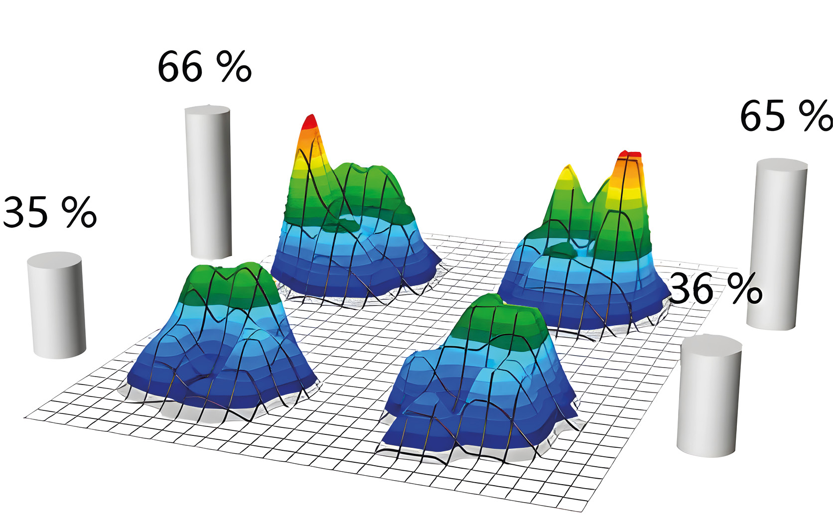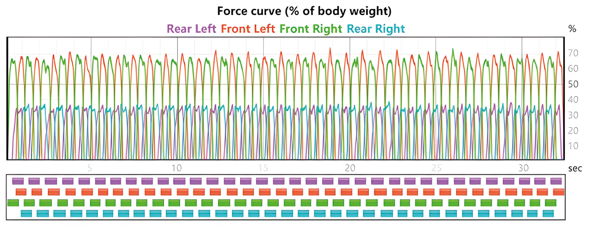 Imagen 3. Gráfica que muestra la distribución del peso corporal en cada uno de los miembros durante una medición en dinámico. En este caso, los porcentajes 66 %, 65 %, 35 % y 36 %, se corresponden con miembro torácico izquierdo, miembro torácico derecho, miembro pélvico izquierdo y miembro pélvico derecho, respectivamente.