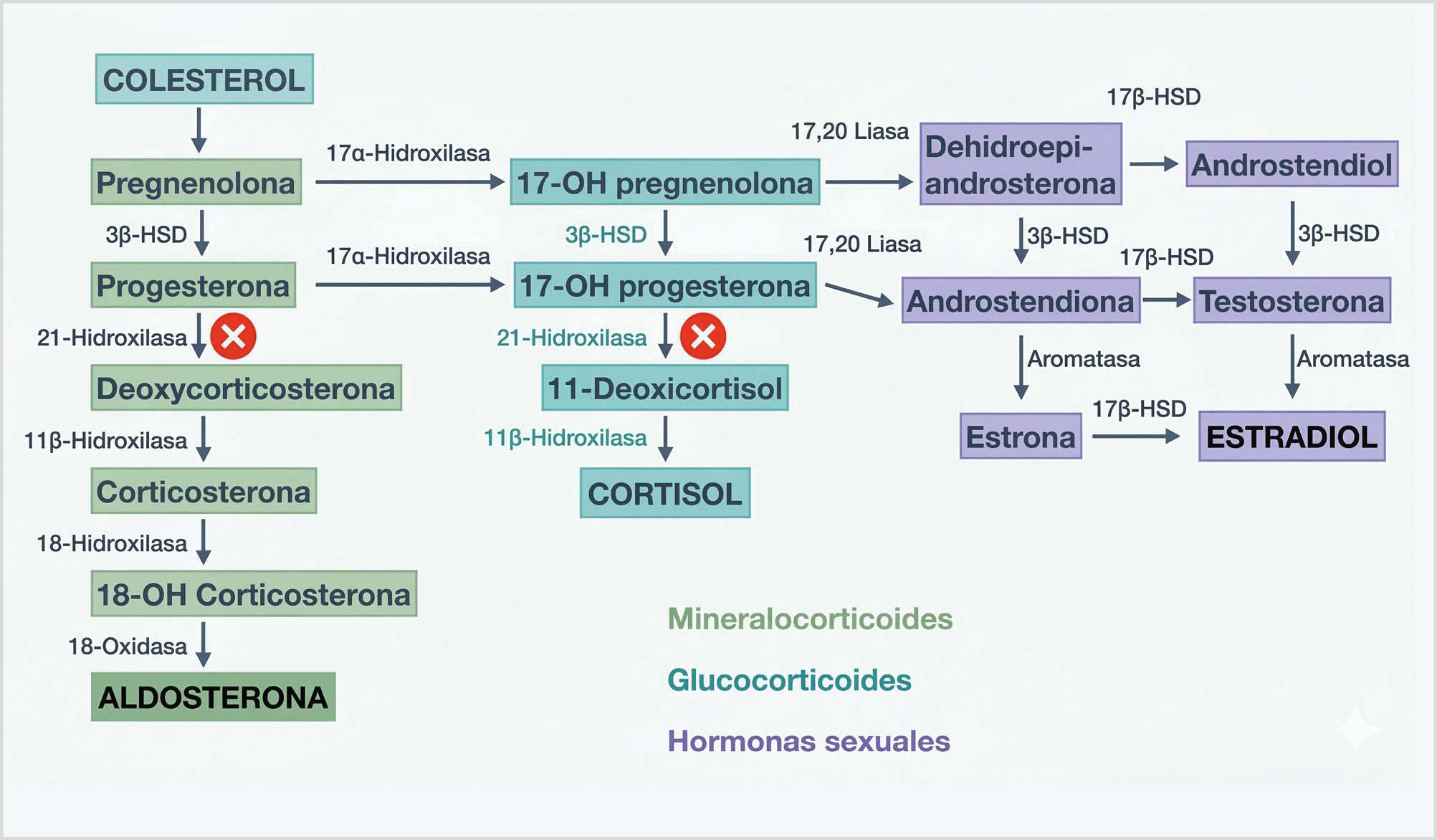 En la década de 1990 surgió una nueva hipótesis que vinculaba la alopecia X a un desequilibrio de hormonas sexuales de origen adrenal. Se planteó la existencia de una deficiencia en la enzima 21-hidroxilasa, similar a la descrita en personas con hiperplasia adrenal congénita, lo que daría lugar a un aumento de 17-hidroxiprogesterona, androstendiona y estradiol (imagen 3). Sin embargo, esta hipótesis presenta importantes limitaciones: en humanos, la hiperplasia adrenal congénita cursa con signos clínicos sistémicos además de las alteraciones cutáneas, mientras que los perros con alopecia X únicamente manifiestan cambios dermatológicos, de manera que se considera un proceso de carácter estético.