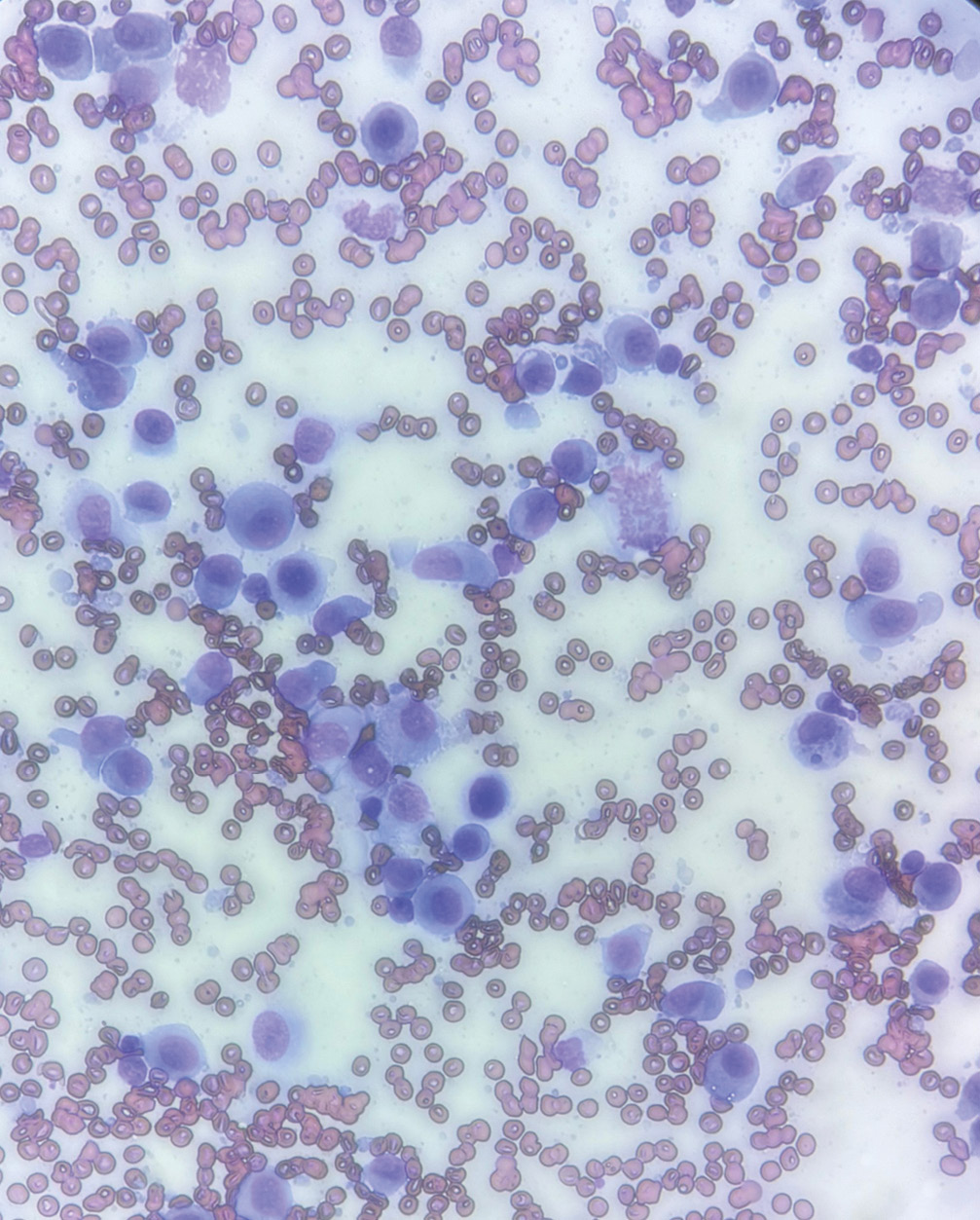 • Citología por punción con aguja fina (PAF) del nódulo: mostró abundantes células nucleadas, mayoritariamente monomórficas y redondas, con anisocariosis leve a moderada. Los núcleos eran ovoides, paracentrales, con cromatina finamente punteada y pequeños nucléolos prominentes. El citoplasma era moderado, basófilo, liso y con aclaramiento periférico. No se observaron agentes infecciosos.