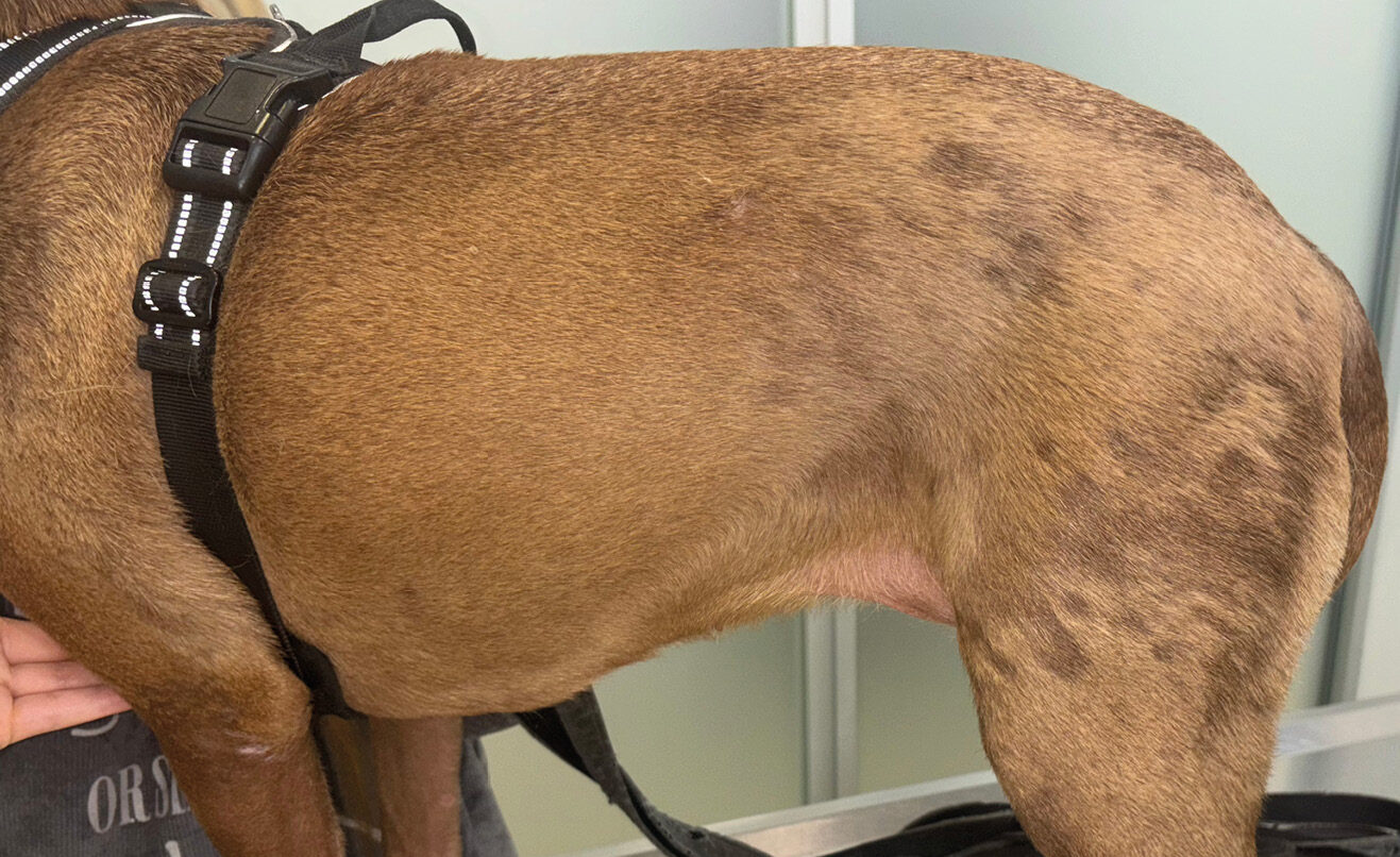 Durante el examen dermatológico se observó alopecia e hipotricosis multifocal, con lesiones distribuidas en la región dorsolateral del tronco y las extremidades. Se apreció una coloración más oscura del pelo en las zonas de recrecimiento.