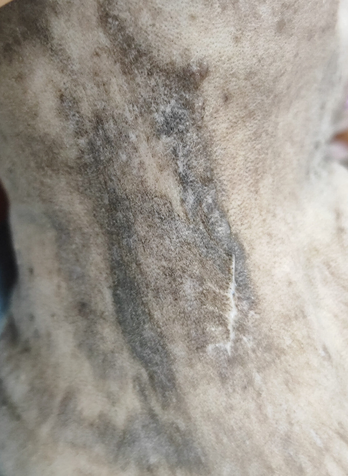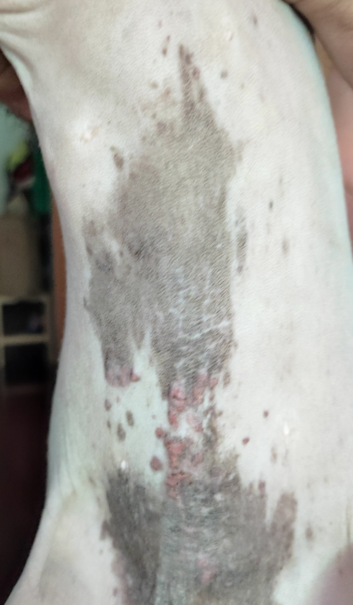 En los dos años posteriores, coincidiendo de nuevo con la primavera, presentó lo que los tutores describen como lesiones “con relieve y engrosamiento de la piel, que primero son de color rojizo y después se oscurecen”, en la región ventral del tórax y el abdomen. En el primer brote estas lesiones se resolvieron sin necesidad de tratamiento, mientras que en el segundo se instauró un ciclo corto de corticoides, del cual no conocemos la duración exacta y la pauta. En opinión de los tutores, no tuvo efecto y finalmente las lesiones desaparecieron posteriormente de forma espontánea.