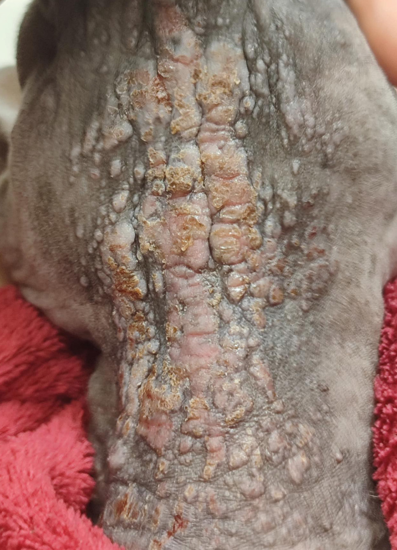 Para el control de los dos diagnósticos diferenciales más probables (mastocitosis cutánea y síndrome atópico) se requeriría medicación inmunomoduladora. El paciente es especialmente sensible a este tipo de terapias por su cardiopatía, y los tutores acceden a realizar una biopsia bajo sedación controlada para estudio histopatológico. También se toma una muestra para cultivo y antibiograma.